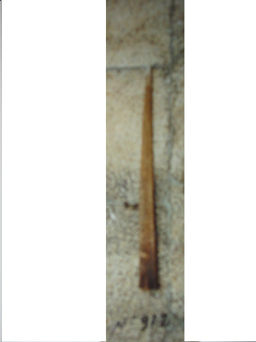 Peza alongada de óso que se estreita progresivamente ata acabar en punta moi afiada. Cor marrón clara. Pertencente a un peixe espada ("Xiphias gladius").