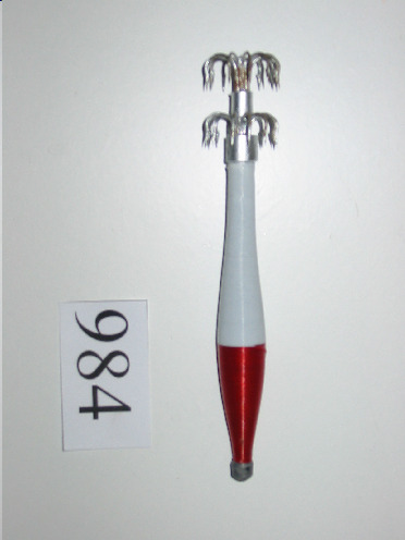 Rama torcida e pulida en forma de punta de flecha á que vai atada unha pedra. A pera, por arriba, tamén está suxeita por dúas ramas xuntadas en forma de V. Ten unha trampilla e un cabo.