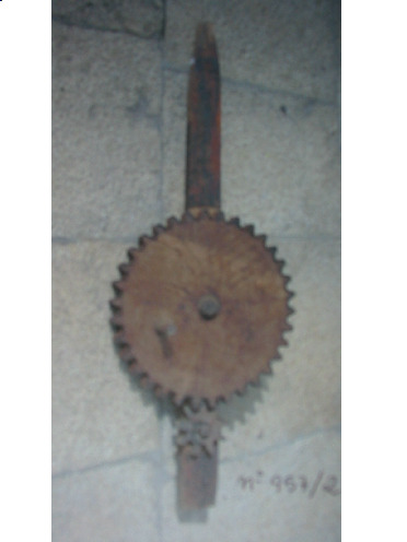 Roda maciza dentada cunha máis pequena estrelada que xiran ó mesmo tempo y en sentidos opostos. O conxunto está suxeito a unha tira de madeira alongada e que sobresae a ambos lados das rodas.