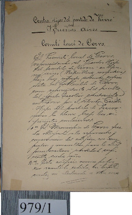 Folio en A3, doblado á metade, algo marelento. Escrito a man por unha soa cara. Comeza:" CENTRO HIJOS DEL PARTIDO DE VIVERO EN BUENOS AIRES- COMITÉ LOCAL DE CERVO". Despois comeza o texto.