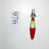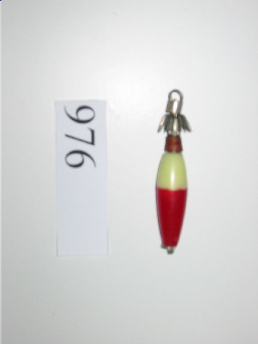 - Ten unha coroa de alfinetes, seguida do corpo de plástico vermello e branco, no cabo ten unha anilla para atar o sedal.