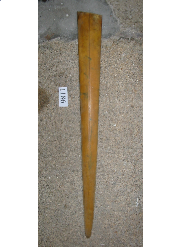 - Peza de óso alongada que se vai estreitando. É de cor marrón claro. Ten manchas de pintura verde.
