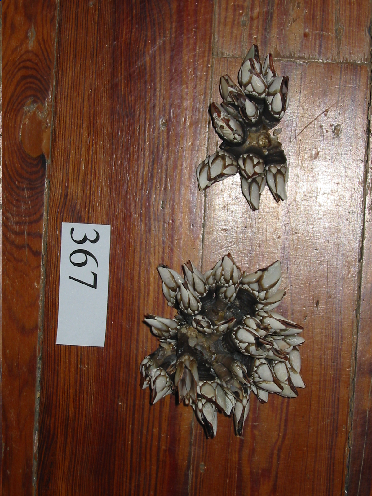 - Pollicipes cornucopia. Dous grupos de percebes e seis individuos soltos. Teñen un pedúnculo vacio quedando só a pel forte e as cunchas de varias pezas que pechan, á maneira de bivalvos o corpo do animal.