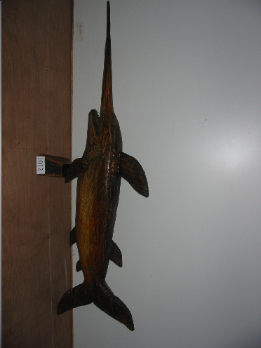 - Peixe espada de madeira. Todo feito nunha peza. Ten unha peana na que se sostén. Está labrado facendo debuxo ó longo do corpo. Na peana ten gravada a cifra 2002 e tamén o nome de quen o fixo.