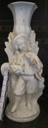 Candeeiro de catro luces en porcelana tipo biscuit, orixinal da fábrica de Sitzendorf. Desmontábel en dúas pezas, base con figuración e vástago de remate, consta de tres brazos a maiores do central que remata a composición. Decorado con motivos florais e de rocalla, todo él en tons amarelos pasteis. O asunto iconográfico representado podería aludir ao amor no seu sentido tráxico en virtude do mito recreado, ainda que de acordo con esa estética rococó máis xuguetona, sofisticada e frívola que segue a peza, inspirada na pintura dun Fragonard ou dun Boucher, por exemplo. Represéntase a Psyche, ou alma humana, acompañada por un putto que poderíamos identificar con Céfiro, o vento enviado por Cupido para salvar á súa amada. Outra posibilidade é que se trate de Anteros, irmán de Cupido e personificación da vinganza do amor non correspondido. Ela vai ataviada cun chitón, coa cabeleira recollida nun moño e suxeito sobre da testa cunha cinta, e descalza. Os dous con ás de bolboreta, o seu atributo máis evidente (tanto de Psyche como de Anteros e o propio Céfiro). Onde a traxedia? Psyche e Anteros/Céfiro sopran pompas de xabrón, emblema clásico da fugacidade do tempo e polo tanto, do amor, coma así lle aconteceu a Psyche.
