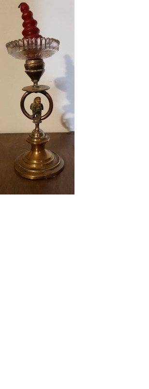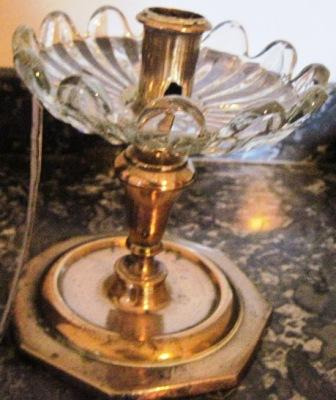 Candeeiro en bronce de pé cadrado e astil abalaustrado con estrangulacións. Basamento troncocónico con aristas concéntricas incisas. Dunha soa luz, presenta no remate repisa exvasada que serve de base a un pratiño en cristal tallado e voado para recoller a cera.