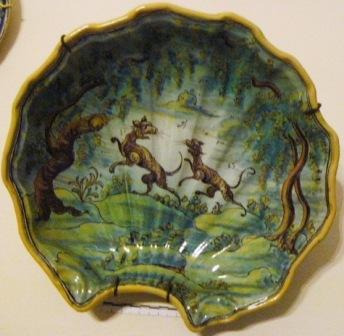 Bacía de barbeiro en cerámica de Talavera, Ruiz de Luna, en forma de cuncha de vieira, con orla en amarelo e emblema central en tons verdes e pardos cunha escena de dous lebreis correndo enmarcados por cadansúa árbore.