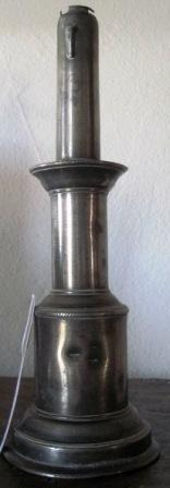 Dosificador xarabeiro en estaño, reaproveitado como candeeiro. Formaba parte dunha enchedora industrial de gasosa da fábrica montada na Coruña en 1868 polo italiano Luis Giavina, premiado con medalla de cobre dez anos antes polos seus traballos de estaño na Exposición de 1858.