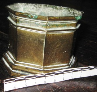 Salvadeira en bronce dourado de corpo octogonal, boca e pé lixeiramente exvasados e moldurados. Non conserva a tapa coas correspondentes perforacións. O borde conta con catro buratos para as plumas.
