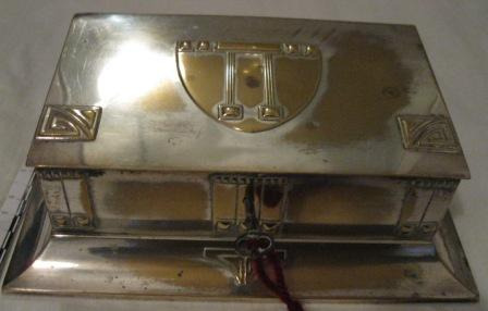 Caixa en madeira policromada con motivos vexetais en tons negros e dourados que nacen dunha peaña tallada en madeira; o borde da parte frontal en pan de ouro.