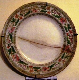 - Prato chan en louza inglesa, de cor branco con cenefa con motivos florais en tons verdes e rosas.