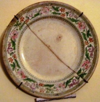 - Prato chan en louza inglesa, de cor branco con cenefa con motivos florais en tons verdes e rosas.