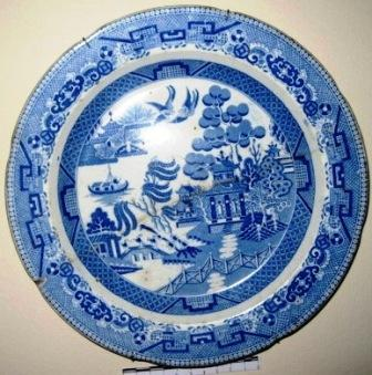 - Prato chan en louza inglesa decorado cunha paisaxe imaxinaria, chinoiserie en cores brancos e azuis. Representación da lenda de Kwang-se mediante estampa calcográfica, modelo "Willow azul" ideado por Thomas Minton en 1779.