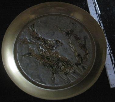 - Prato chan en bronce con debuxos de páxaros en esmalte.