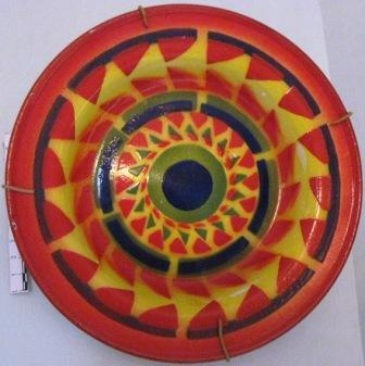 - Prato chino en latón con debuxos xeométricos en esmalte, en tons verdes, amarelos, azuis e vermellos.