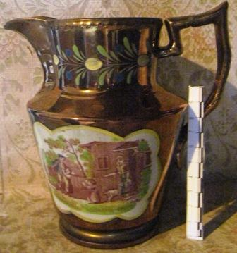 - Xerra de cerámica de Bristol de reflexos dourados con dúas escenas familiares nunha contorna do rural dezaoitesco inglés e motivos vexetais.