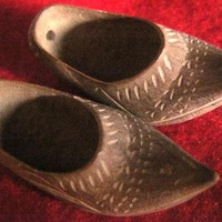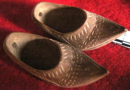 - Conxunto de dúas zocas en miniatura realizadas en madeira de biduieira tallada.