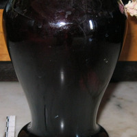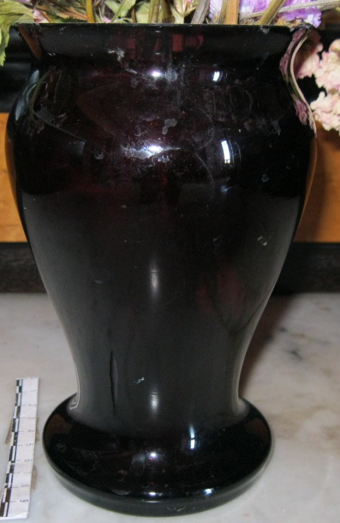 - Floreiro en cristal morado de corpo troncocónico invertido con estrangulamento á altura da boca.