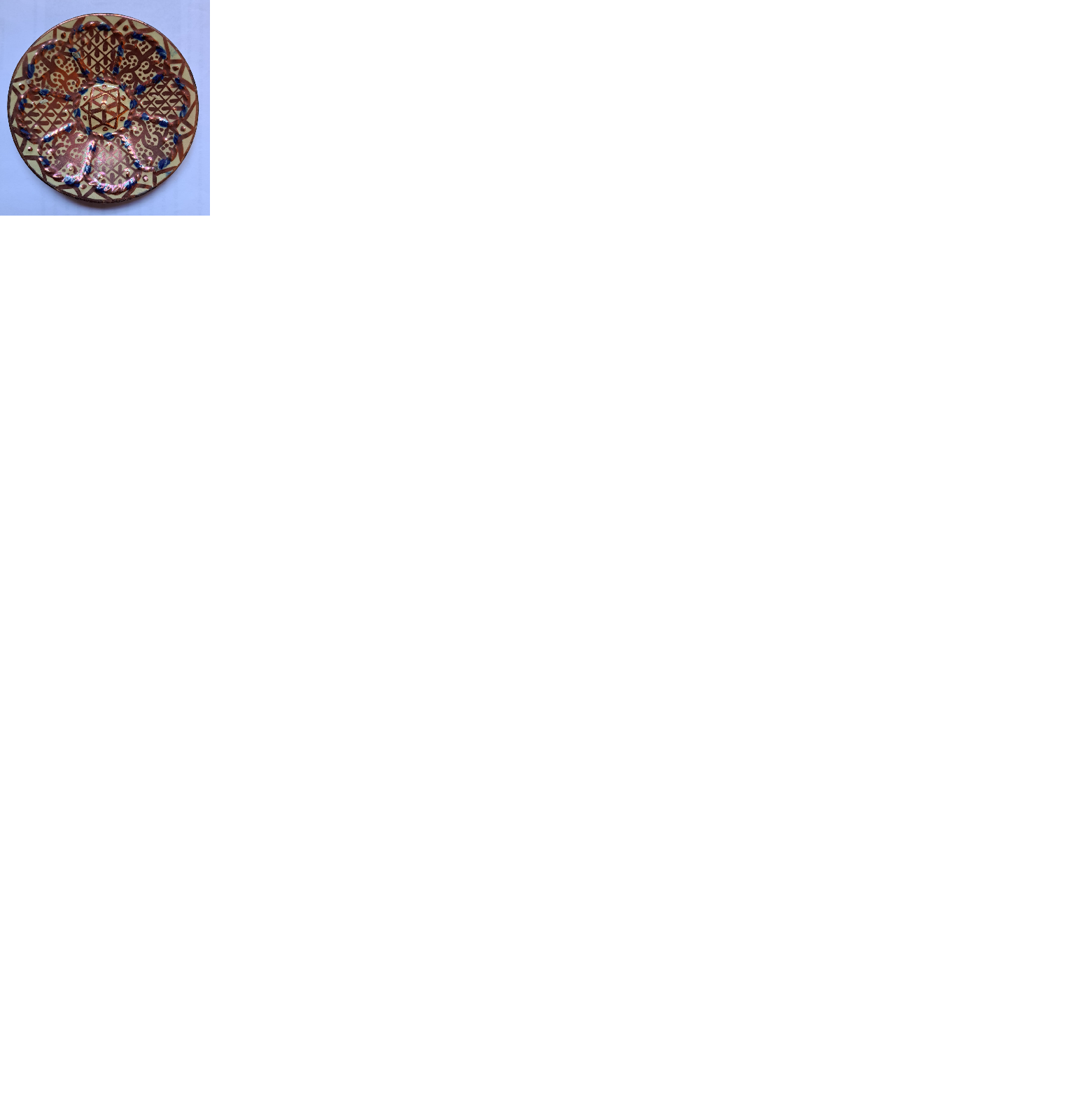 - Pratiño semifondo de louza cocida con cuberta de esmaltes estanníferos de reflexos metálicos tipo mudéxar, cor cobre, e pinceladas azul cobalto que debuxan unha flor octopétala. Na corola, que ocupa o centro mesmo do prato nun lixeirísimo umbo (reminiscente da produción renacentista de Manises), unha estrela de David coa bisetriz marcada. No campo dos pétalos altérnase a decoración de reflexos acantiformes coa de losanges, raiados cun pinxante diagonal, finxindo perspectiva.