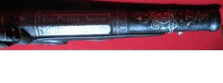 - Pistola de avancarga de pistón, canón en ferro con filigranas prateadas e con inscrición. Culata en madeira.