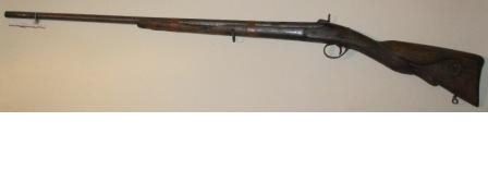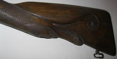 - Mosquete de pistón de avancarga. Culata en madeira tallada cun mascarón, tarxa vexetal e voluta rematada nunha flor de catro pétalos.