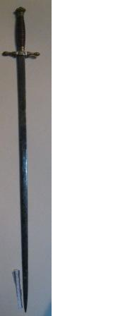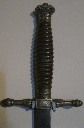 - Espadín de cruz ou arraz rematada en flor con empuñadura de hasta e bronce rematada nunha coroa e coas iniciais gravadas "VE". Lamia lisa e dunha mesa