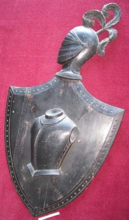 - Panoplia en madeira en forma de escudo con helmo que serve de soporte a tres espadas.