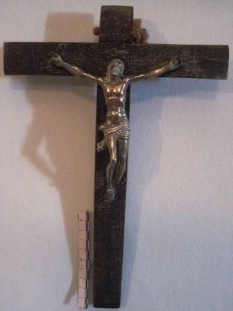 - Cruz en madeira formando debuxos, arabescos e aréola, con craviños en bronce. A cruz é simple e escadrada. O Crucificado, fundido en bronce, é de tres cravos.