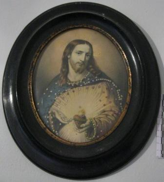 - Cromolitografía coa imaxe do Sagrado Corazón de Xesús: Cristo cardióforo de tres cuartos, co corazón ardente na esquerda surmontado por unha cruz. Segue o arquetipo iconográfico asentado por Pompeo Batoni. Marco ovalado en madeira de cor negro e no interior filete dourado.