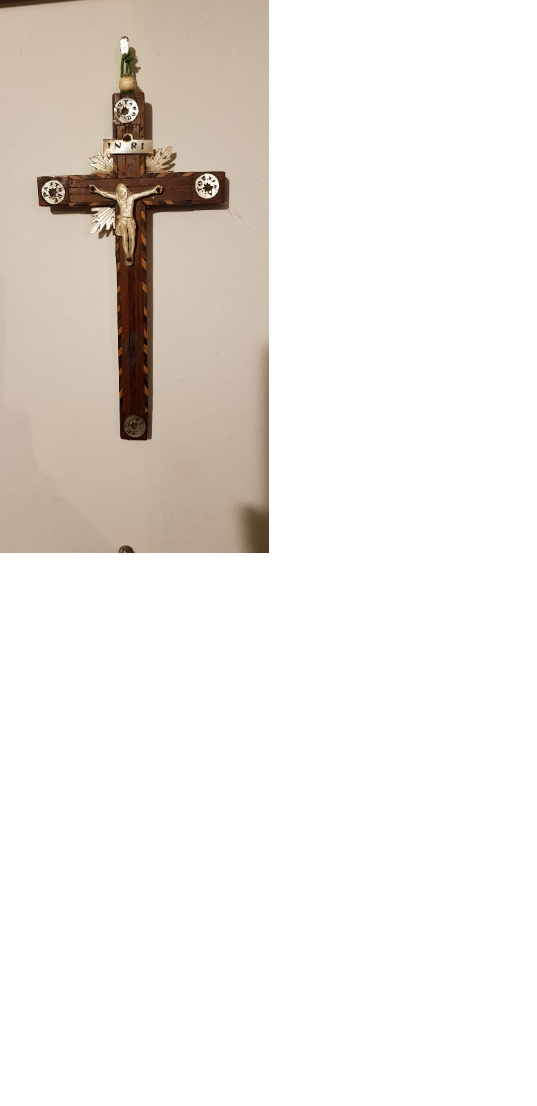 - Crucifixo relicario en madeira de oliveira con fileteados en marquetería. A cruz é simple, co titulus de rigor, e escadrada. Conta con catro discos en nácara nos cadrantes da cruz coa inscrición PASTOR DELATE TORSINA. Cun crucificado de tres cravos, sobreposto e en nácara, acompañado de catro ráfagas (perdeu unha delas) en nácara e o INRI (Iesus Nazarenus Rex Iudeorum); Este tipo de cruces procede dos Santos Lugares, de onde chegaron a Occidente como obxectos de recordo de peregrinación. Un dos factores de riqueza dos cristiáns en Palestina foi a industria ou artesanía de rosarios, cruces e toda clase de souvenires relixiosos dos Santos Lugares, fabricados con madeira de oliveira, nácara e outras materias, recordos propiciados polos franciscanos da Obra Pía de Xerusalén, institución benéfico-piadosa destinada á conservación, acrecentamento e restauración dos Santuarios de Terra Santa. Esta cruz responde ao exercicio piadoso de Vía Crucis, costume iniciada en Xerusalén da man dos franciscanos, recompensada dende o principio cun gran número de indulxencias. O Vía Crucis evocaba mediante catorce estacións ou etapas, o camiño percorrido por Cristo durante a Paixón. En 1773 o papa Clemente XIV concedeu as mesmas indulxencias ao rezo do Vía Crucis na casa, sempre que o devoto sostivese entre as súas mans unha cruz. De aí a multiplicación da produción de cruces adornadas con círculos de nácara alusivas ás estacións. Acrecentouse así mesmo a exportación ao Occidente.