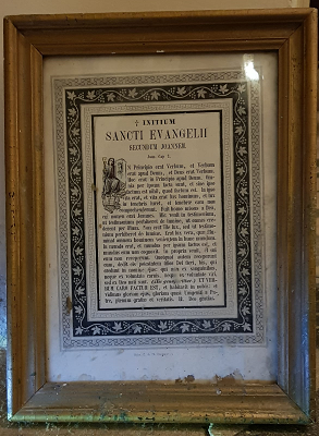 - Cadro que recolle o comezo do Santo Evanxeo en latín. Con marco en madeira dourada. Este cadro colócase no lado dereito do altar.