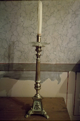 - Facheiro en bronce con pé troncopiramidal apoiado en garras. Nas caras do basamento, imaxes repuxadas do Sagrado Corazón de Xesús, de María e de Xesús Novo portando a cruz. Vástago acanalado, abalaustrado, con estrangulamento na macolla e molduras gallonadas no sumóscapo e remate. Conta con pratiño de cristal voado para recoller a cera. Semellante aos producidos por Meneses.