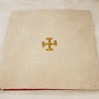 - Bolsa de corporais en seda natural adamascada de cor vermella con motivos florais e vexetais en fío de ouro, e ribeteado con pasamanería da mesma finta dourada.