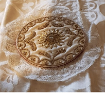 - Palia de forma circular, bordada con fíos de ouro e lentexoula. Na parte central, en calidade de emblema, un sol cunha pedra transparente no medio.