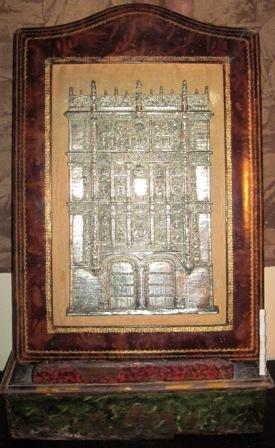 - Baixorrelevo do taller madrileño de Arnillas y Matallana, da primeira época, de metal bañado en prata coa imaxe da fachada de Universidade de Salamanca; marco en pel con cenefas en ouro. Apoiado nunha peaña de madeira do seéculo XIX, policromada en verde e roxo.
