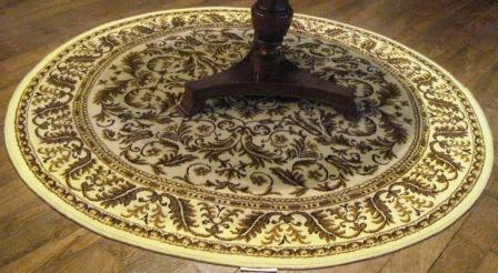 - Alfombra de lá circular de fondo beixe e motivos florais en marrón.