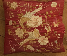 - Coxín en raso de seda natural con granate bordado no anverso con motivos florais e dous faisáns coas alas pregadas.