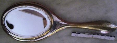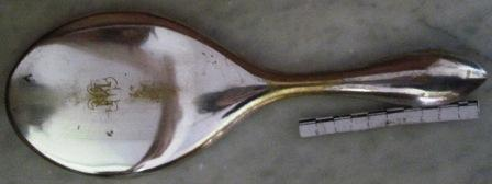 - Espello de toucador en metal bañado en prata e as iniciais gravadas "MM"(Mª Paz e Miguel Angel)