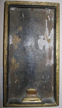 - Caixa en madeira policromada con motivos vexetais en tons negros e dourados que nacen dunha peaña tallada en madeira; o borde da parte frontal en pan de ouro.