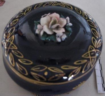 - Caixa para gardar os pós en porcelana de fondo azul cobalto, decorada con motivos vexetais en ouro e na parte central da tapa un flor sobreposta.