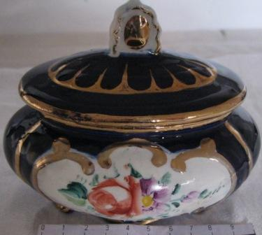 - Caixa de toucador con tapadeira fondo azul cobalto motivos en ouro, e dúas escenas con motivos florais.