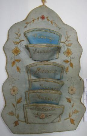 - Semanario tarxeteiro coa alma de cartón forrada en tea azul e bordado con motivos florais en dourado. Conta con seis departamentos para cada día da semana co nome correspondente bordado en letra inglesa. Fáltalle o martes