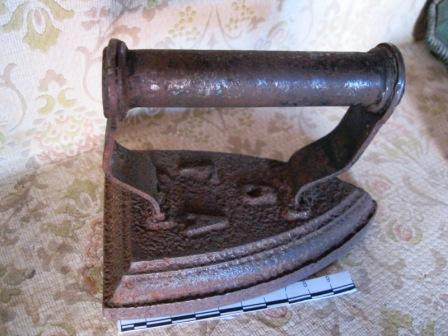 - Ferro de pasar fundido en ferro, de cociña ou quecer, do nº 5, con puño tamén en ferro. Iniciais F A.