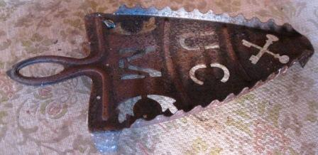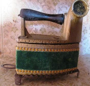 - Ferro de pasar fundido ferro, de brasas ou carbón, forrada en veludo verde. Puño en madeira. Conta con cheminea e conserva o soporte repousa-pranchas decorado en tres bandas. Na superior, chaves en aspa. Na do medio, iniciais U C. Abaixo, unha M. Todo calado.