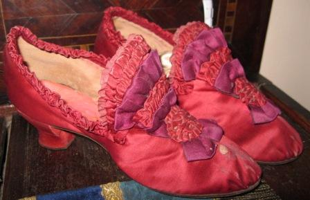 - Conxunto dun par de zapatos femininos pertencentes a Dona Paz de Zúñiga do nº 32 feitos en tea de raso de seda en cor vermello e sola en coiro.