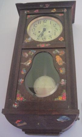 - Reloxo de parede con péndulo, caixa en madeira de castiñeiro , decorado con calcomanías de flores e paxaros.
