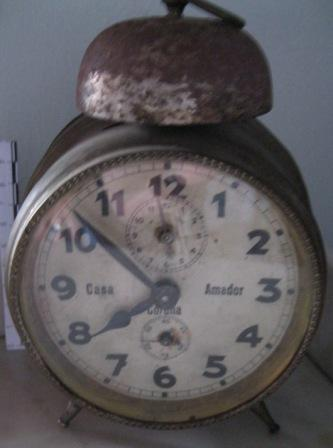 - Reloxo espertador de sobremesa e de corda; con esfera independente para os segundos e para o espertador. Apoiado en dous pés, e na parte superior o timbre. Tapa da maquinaria cun debuxo inciso en forma de estrela de oito puntas.