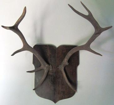 - Panoplia en madeira en forma de escudo que suxeita dous cornos de cervo, de seis puntas cada un.