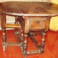 - Mesa encartable de centro en madeira de castiñeiro con dúas ás pregables e dous caixóns laterais (un a cada lado) e oito patas en madeira torneada e aneis lenticulares (dúas delas abatibles).