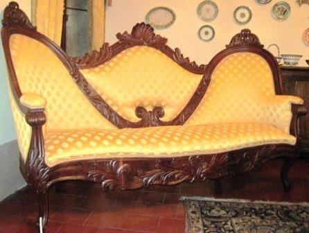 - Sofá tres prazas isabelino en madeira de caoba tallada con motivos vexetais, de palmeta acantiforme nos brazos e divisións en aspa avolutada dos asentos, coroados estes con copetes calados nos extremos e central avenerado; salienta o amplo faldón tallado con motivos fitomórficos e as patas, que son cabriolé, co recorrente ornamento en forma de palma de loureiro, reminiscente do estilo Imperio. A tapicería en cor amarelo (a orixinal era vermella).